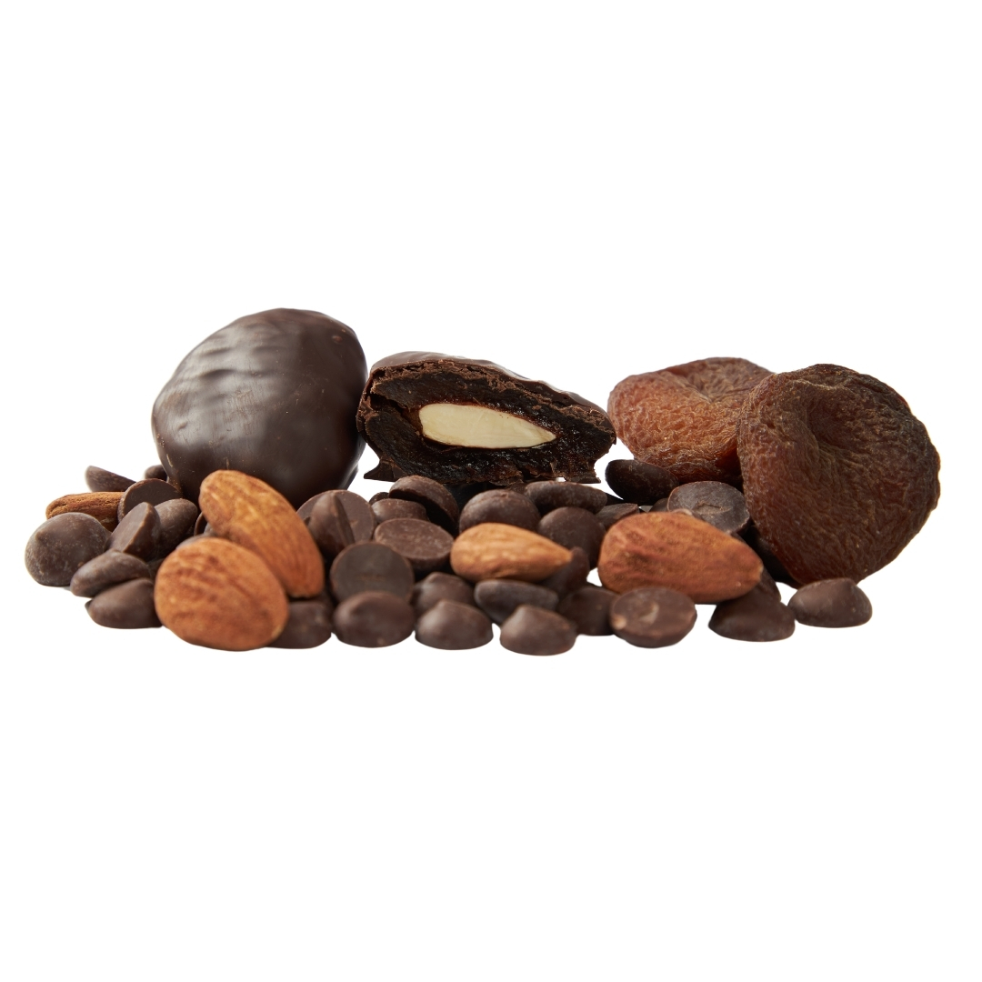 Ingredients: Dried apricot 54%, dark couverture chocolate 38% (cocoa mass, sugar, cocoa butter, emulsifier (soy lecithin), natural vanilla flavouring), whole almonds 8%.