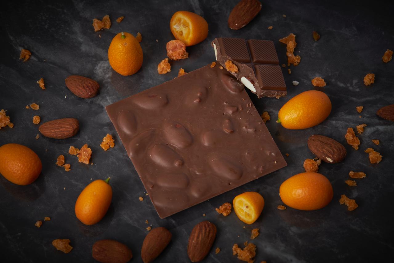 Sütlü çikolata (%30 kakao kuru maddesi içerir) %76 (şeker, kakao yağı, tam yağlı süt tozu, kakao kitlesi, emülgatör (soya lesitini), doğal vanilya aroması), badem %12, kumkuat %12.