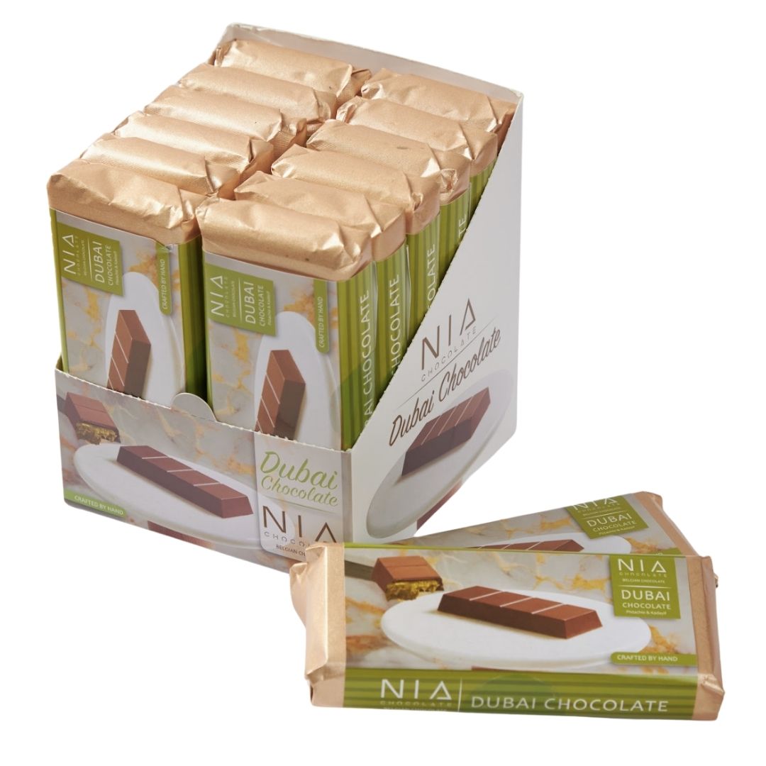 İçindekiler: Sütlü çikolata %65 (şeker, kakao yağı, tam yağlı süt tozu, kakao kitlesi, emülgatör (soya lesitini), doğal vanilya aroması), dolgu %35 (antep fıstığı %40, tahin kreması (şeker, bitkisel yağ (susam, ayçiçek yağı), süt tozu, laktoz), çıtır kadayıf parçacıkları %9 (buğday unu (gluten), şeker).